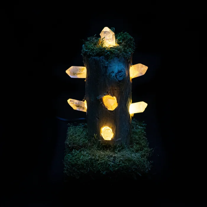 Kendi tasarımımız olan gece lambası serimizin ilk ürününde minik çimlerle kaplı ahşap hobbit evleri oluşturduk ve içlerindeki enerjiyi dışarı yaymaları için kristal kuvars dişler kullandık. Ürünümüzün boyu 17 cm’dir. Genişliği ise 12 cm’dir. Üzerinde 7 adet iri diş kuvars bulunmaktadır. Sarı led ışıkla aydınlanmakla birlikte rahat kullanım sağlamanız için üzerinde jack girişi de bulunmaktadır.