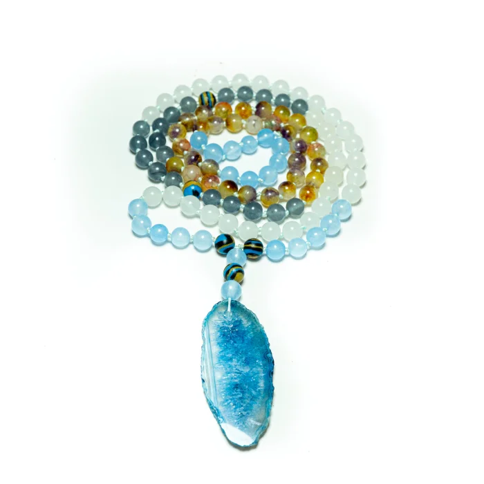 Mavi plaka akik kullanılan niyet malamızda, malahit, selenit ve jade taşları kullanılmıştır.