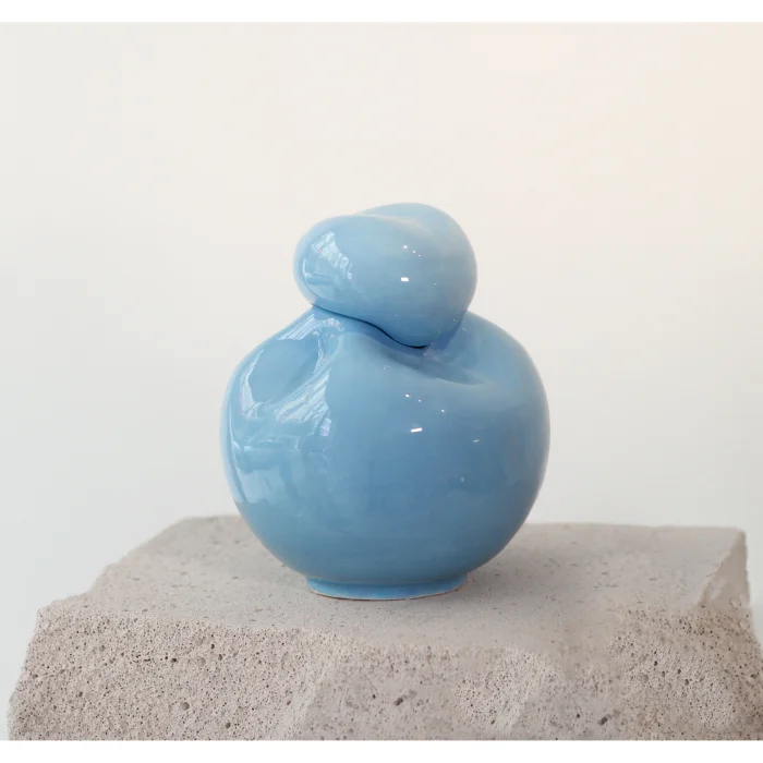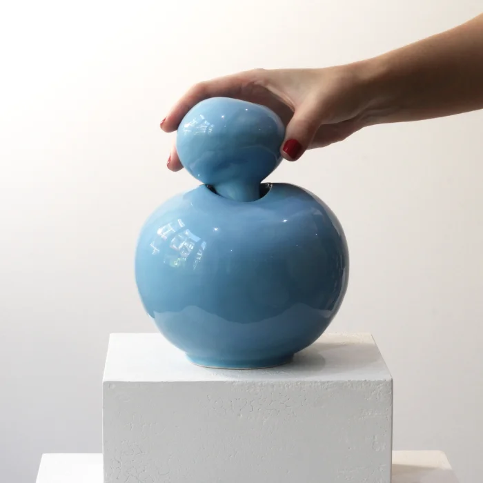 Parlak turkuaz renkli kapaklı seramik vazo.