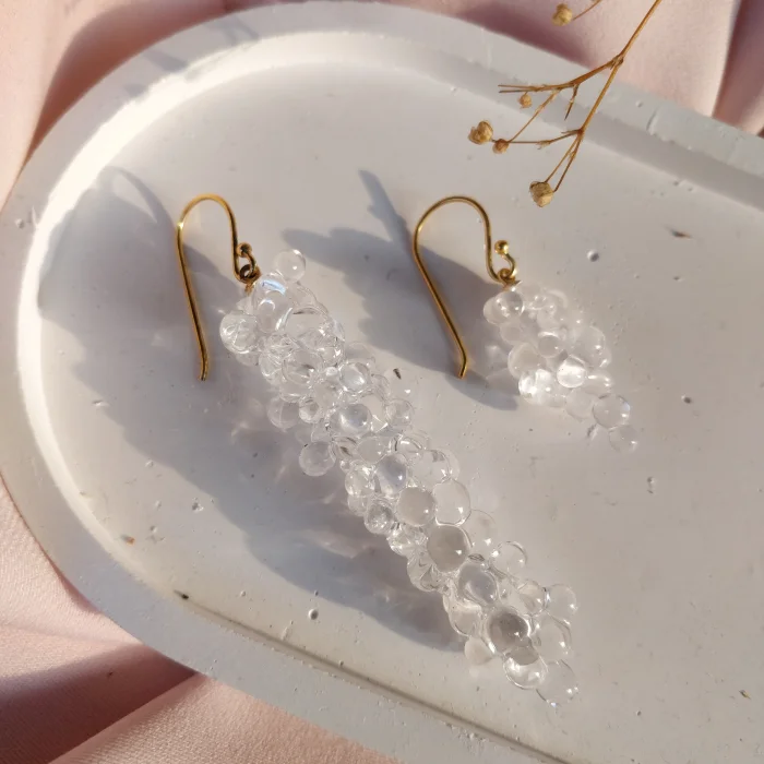 1200 derece açık alev cam tekniğiyle yapılmıştır, eşsizdir. Küpe materyali 925 ayar gümüş üzeri 22K altın kaplamadır. Transparan şeffaf cam kullanılmıştır.