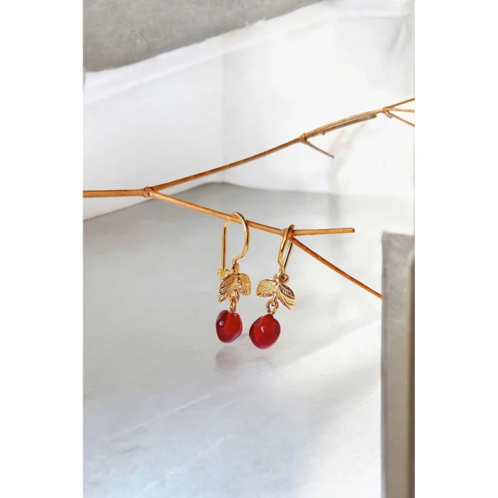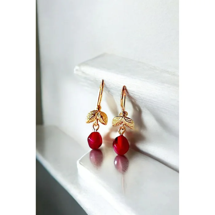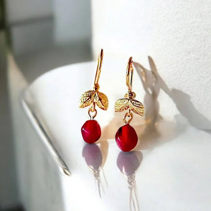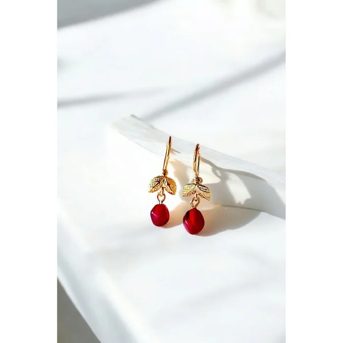 Narlar 1200 derecede açık alev cam tekniğiyle yapılmış olup eşssizdir. Küpe meteryali 925 ayar gümüş üzeri altın kaplamadır.