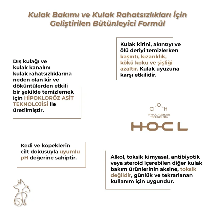 Kahu Naturals Kulak Temizleme Solüsyonu, kedi ve köpeklerin sıklıkla kulak rahatsızlıklarına neden olan dış kulağı ve kulak kanalını kir ve döküntülerden düzgün bir şekilde temizlemek için hipokloröz asit teknolojisi ile üretilmiştir. Alkol veya steroid içermez, tahriş edici değildir bu nedenle günlük ve tekrarlanan kullanım için uygundur.