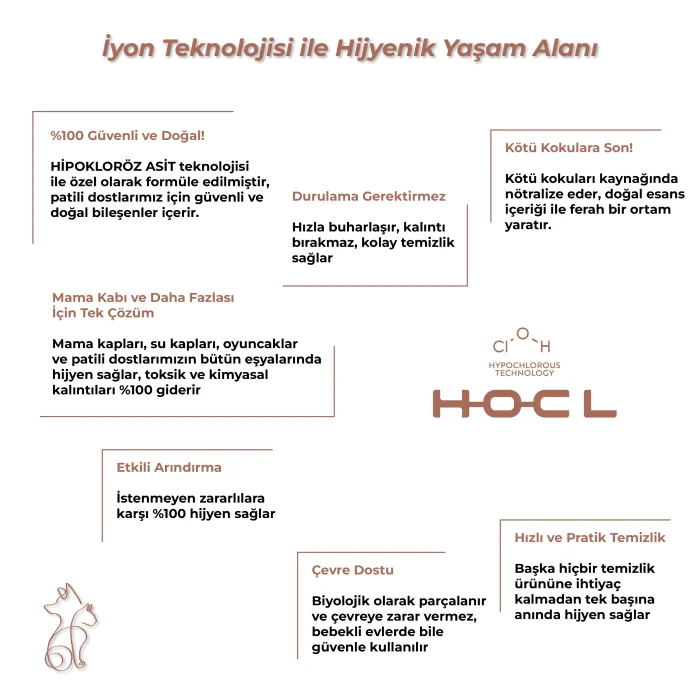Günlük tekrarlanan kullanım için uygundur. Durulama gerektirmez ve patili dostlarımızın yalaması durumunda zararsızdır.
