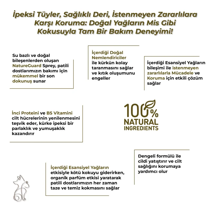 İçerdiği esansiyel yağların karışımı kötü kokuyu giderirken, organik parfüm etkisi yaratarak patili dostlarımızın her zaman taze ve temiz kokmasını sağlar.