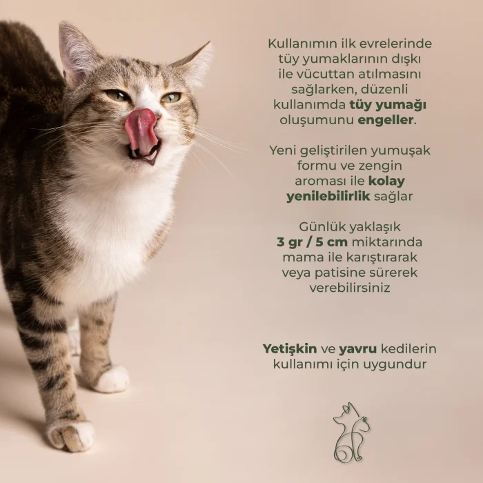 · Biyotin içeriği sayesinde parlak ve sağlıklı tüy yapısının korunmasını ve cilt sağlığını destekler, tüy dökülmesini azaltır ve tüy yumağı oluşumunu engeller.