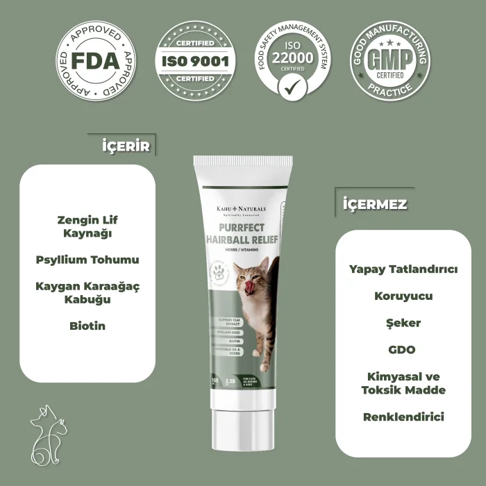 Kahu Naturals Purrfect Tüy Yumağı Giderici Doğal Kedi Maltı, kedilerin yutup sindiremedikleri tüy yumağının birbirine yapışmasını ve birikmesini önlemek, gidermek ve sindirim yolundan daha rahat bir şekilde atılmasını sağlamak için özel olarak formüle edilmiştir. İçerisindeki lifler, malt özleri ve yüksek kalitedeki doğal bileşenler sayesinde tüylerin sindirimi ve kusmaya neden olmadan dışkılama yoluyla atılması sağlanır.