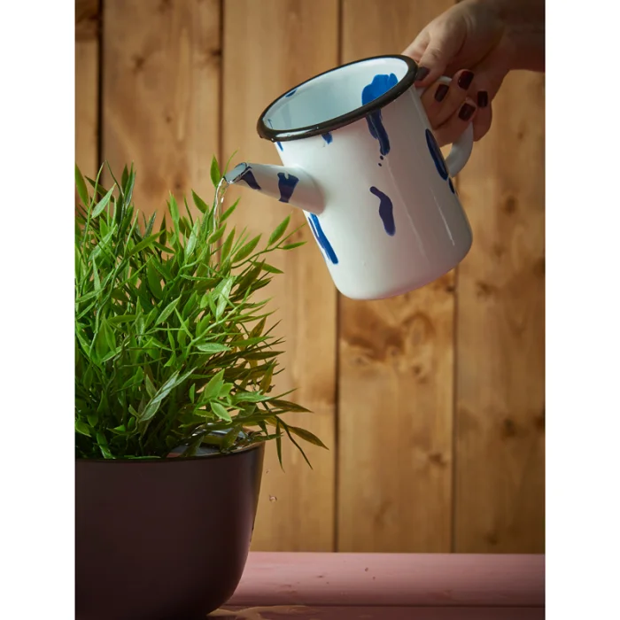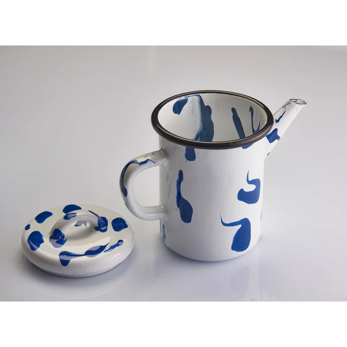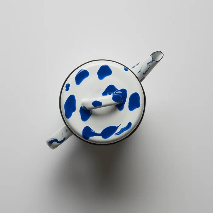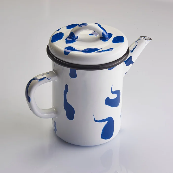 Akıtma tekniği kullanılarak her biri tek tek üretilen siyah kenarlı ve kapaklı mavi-beyaz emaye demlik.