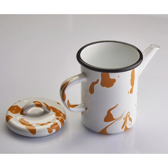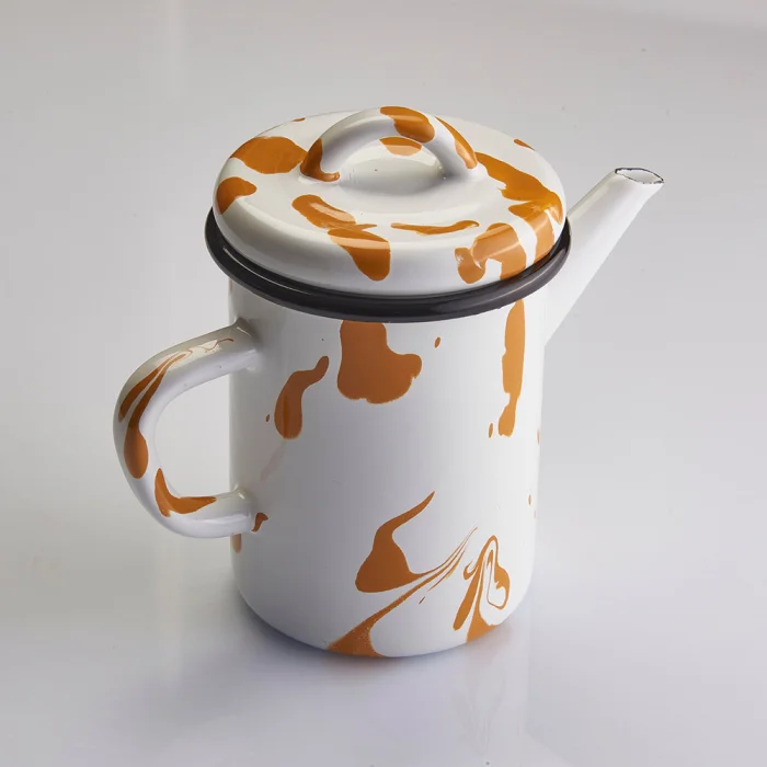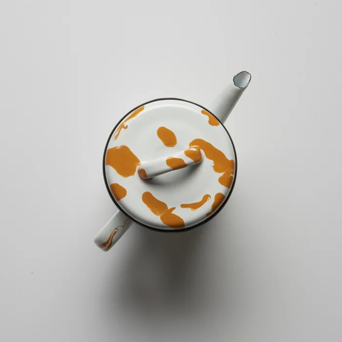 Akıtma tekniği kullanılarak her biri tek tek üretilen siyah kenarlı ve kapaklı sarı-beyaz emaye demlik.