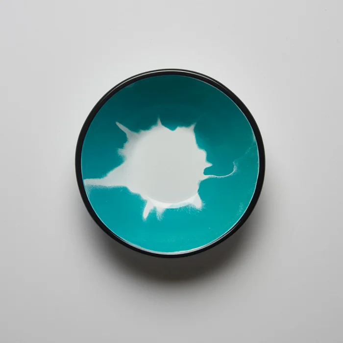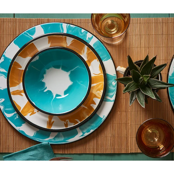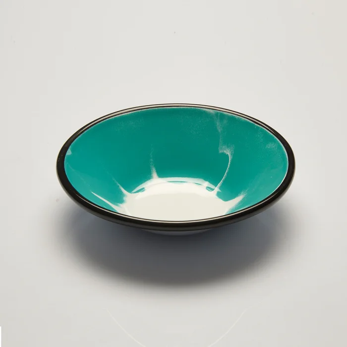 Akıtma tekniği kullanılarak her biri el işciliği ile tek tek üretilen siyah kenarlı turkuaz-beyaz emaye çorba kasesi.