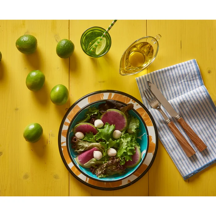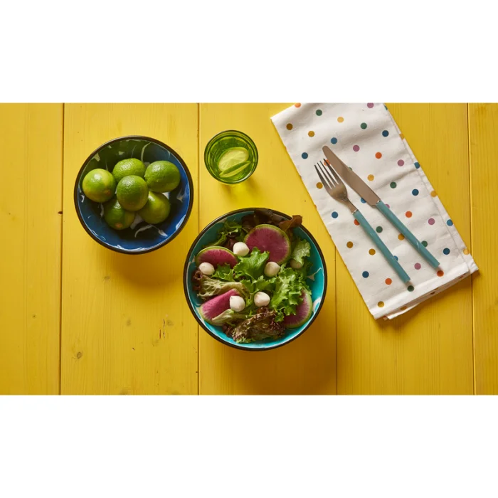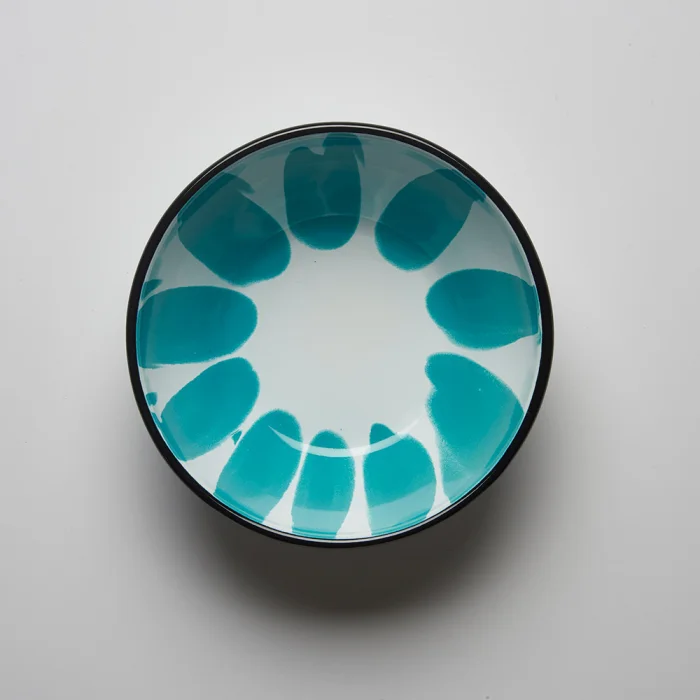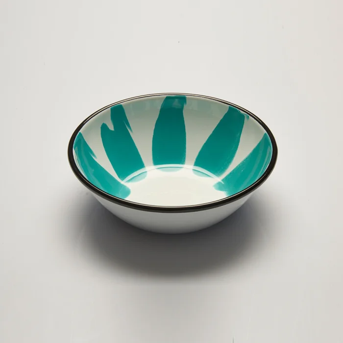Akıtma tekniği kullanılarak her biri el işciliği ile tek tek üretilen siyah kenarlı turkuaz-beyaz emaye salata kasesi.