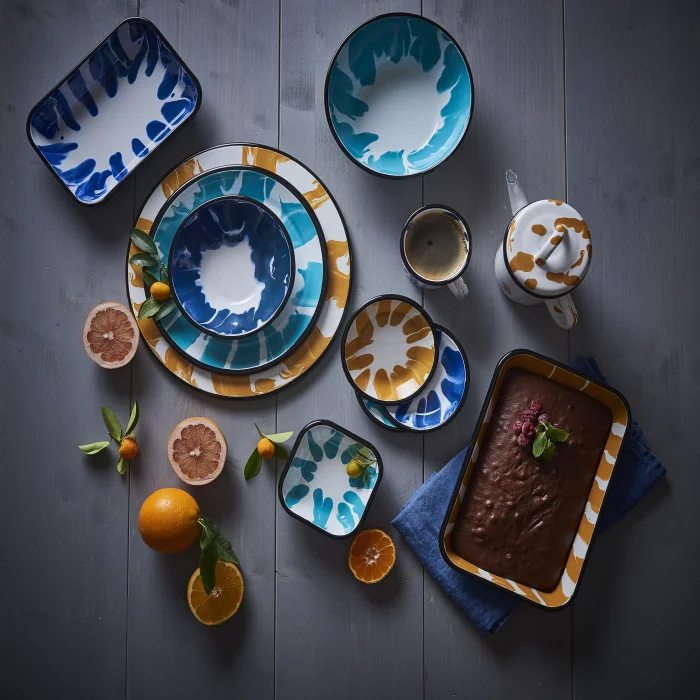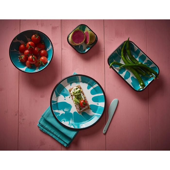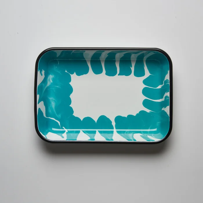 Akıtma tekniği kullanılarak her biri el işciliği ile tek tek üretilen siyah kenarlı turkuaz-beyaz emaye servis tabağı.