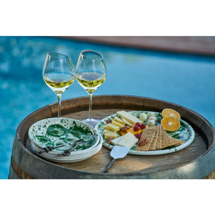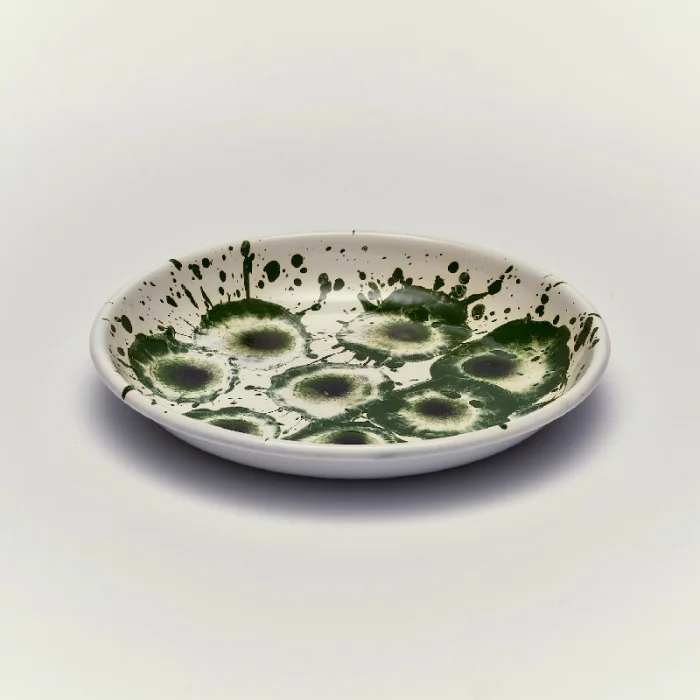Püskürme tekniği kullanılarak her biri el işciliği ile tek tek üretilen desenli emaye küçük tabak.