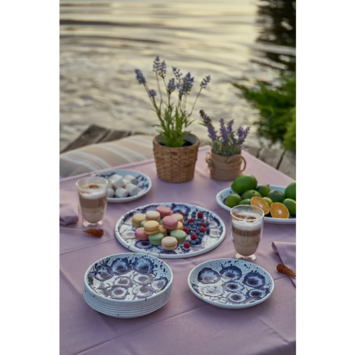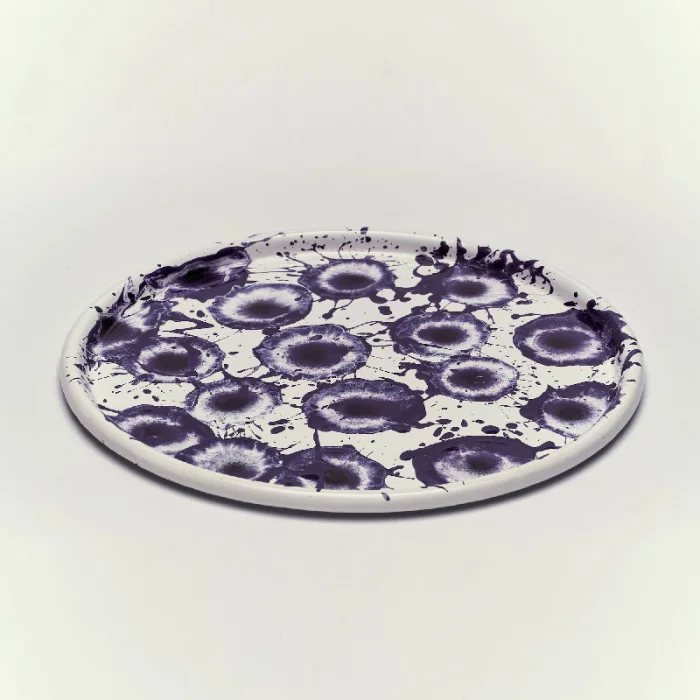 Püskürme tekniği kullanılarak her biri el işciliği ile tek tek üretilen desenli emaye tepsi.