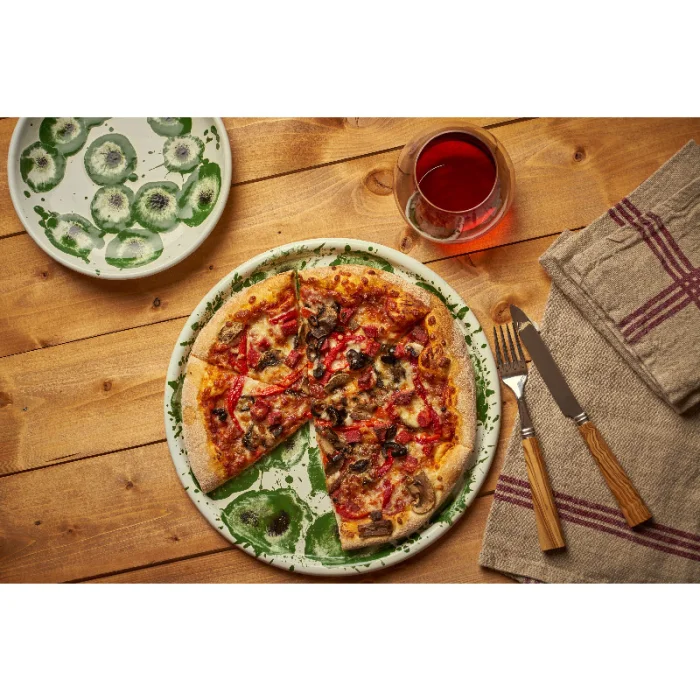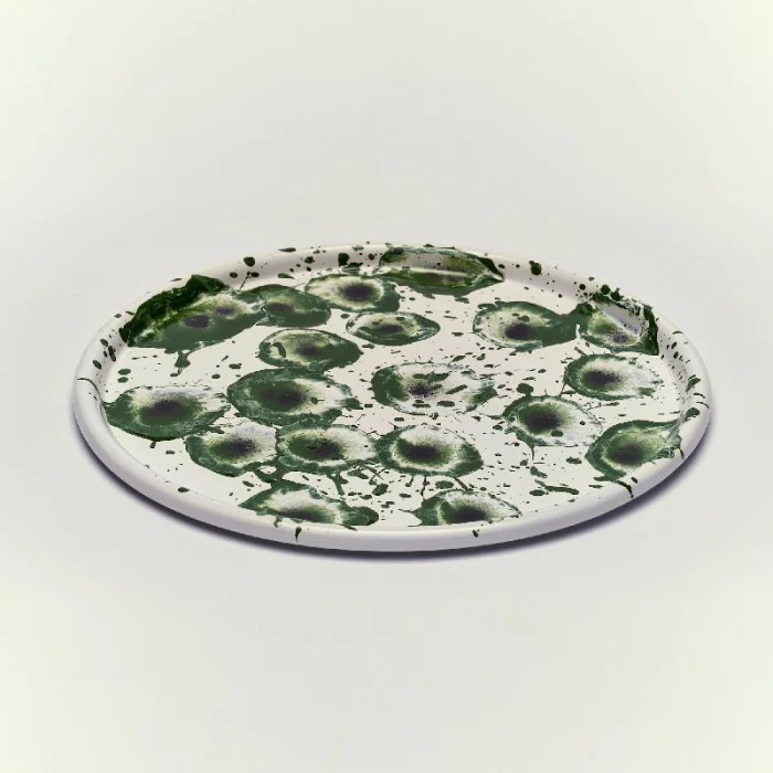 Püskürme tekniği kullanılarak her biri el işciliği ile tek tek üretilen desenli emaye tepsi.