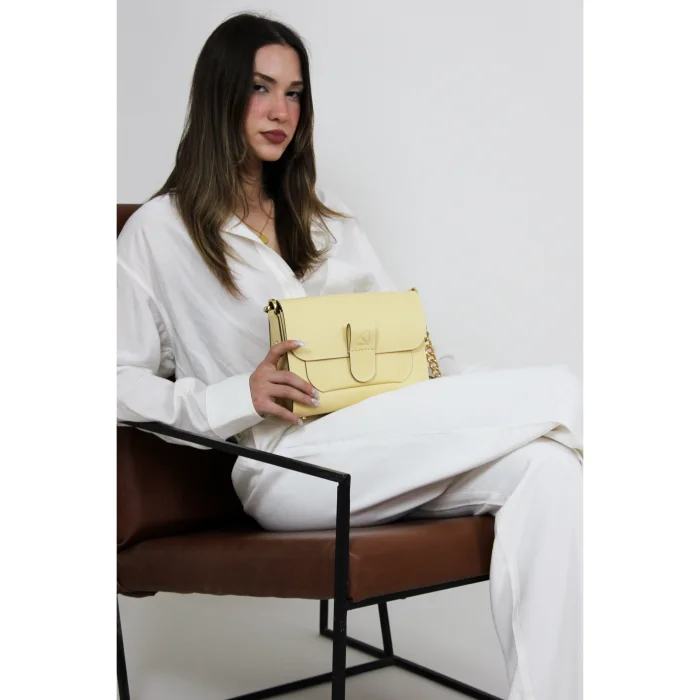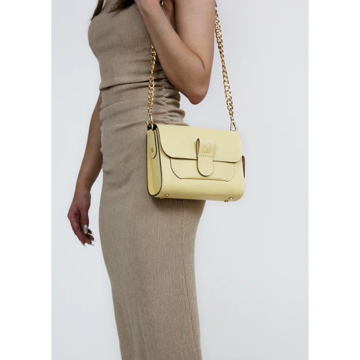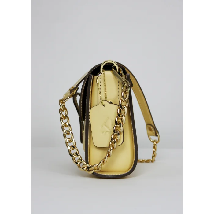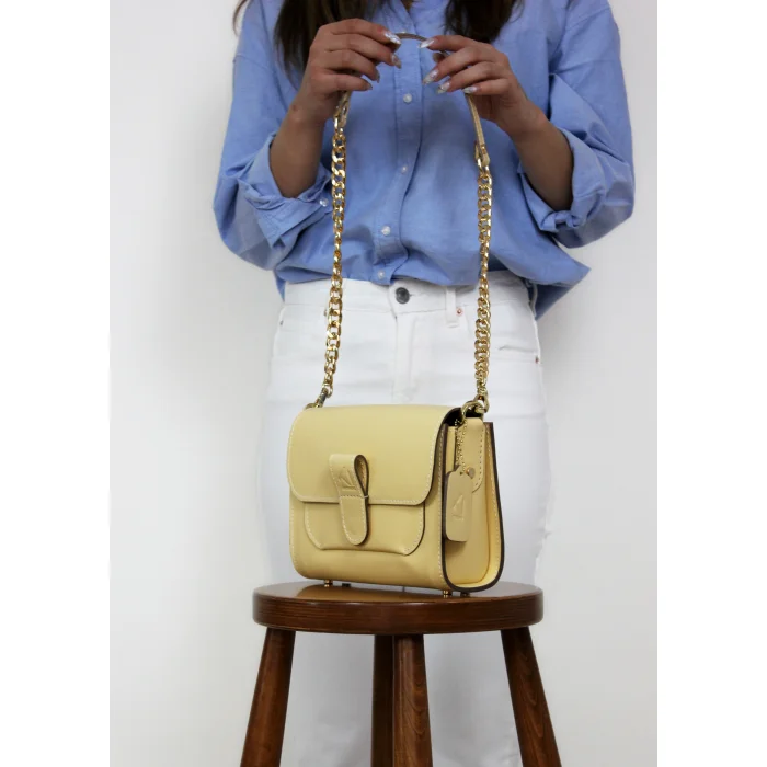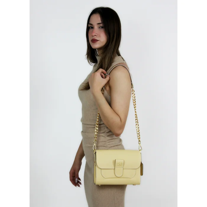 Merry Handbag yüksek kaliteli dana derisi ve dana astar ile üretilen, mıknatıslı kapak tasarımı ile konforlu bir kullanım sunan, değiştirilebilir kısa omuz ve el sapının yanında uzun zincir detaylı sap seçenekleriyle alternatif kullanım şekilleri olan bir çantadır. İç tasarımında bulunan cep detayı ile fonksiyonel bir kullanıma sahiptir. Tasarımında kullanılan yüksek kaliteli light gold renkli metal aksesuarları ile göz alıcı şık detaylar yakalnmıştır.