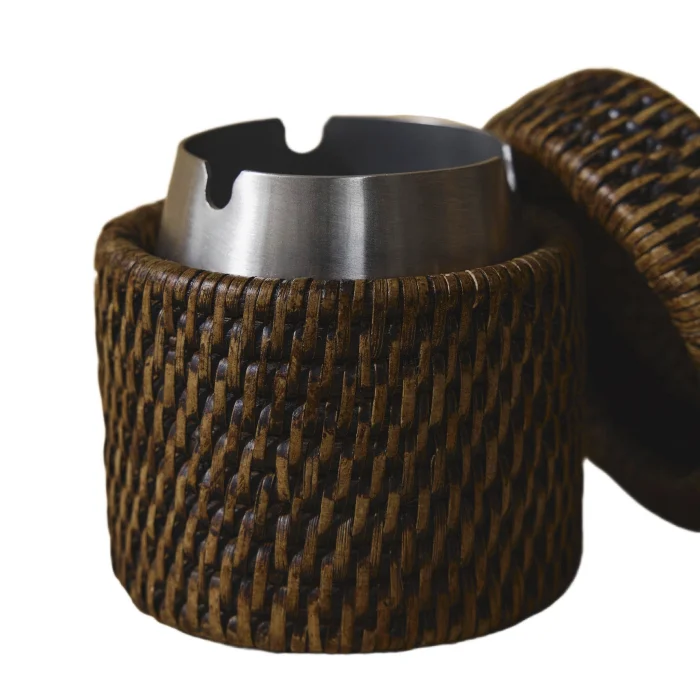 Yüksek Rattan Kül Tablası: Sürdürülebilebilir 1. sınıf rattan kullanılarak yapılan bu ürünümüz, Yangon’daki usta zanaatkarların kullandığı geleneksel sıkı el örmesi tekniğiyle yapılmıştır. Renk: Mat Koyu Kahve Malzeme: El Yapımı Rattan, Paslanmaz Çelik Boyut: 9(U)X9(G)X10(Y) cm
