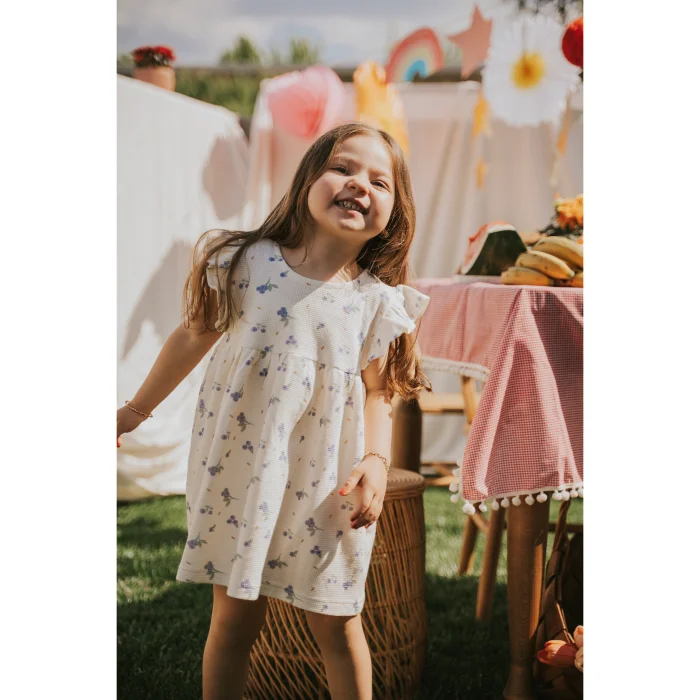 Baskılı deseni ile dikkat çeken elbise, çocukların enerjisini yansıtan canlı ve eğlenceli bir görünüm sağlar.