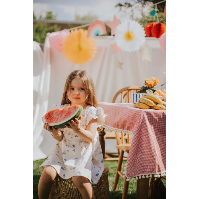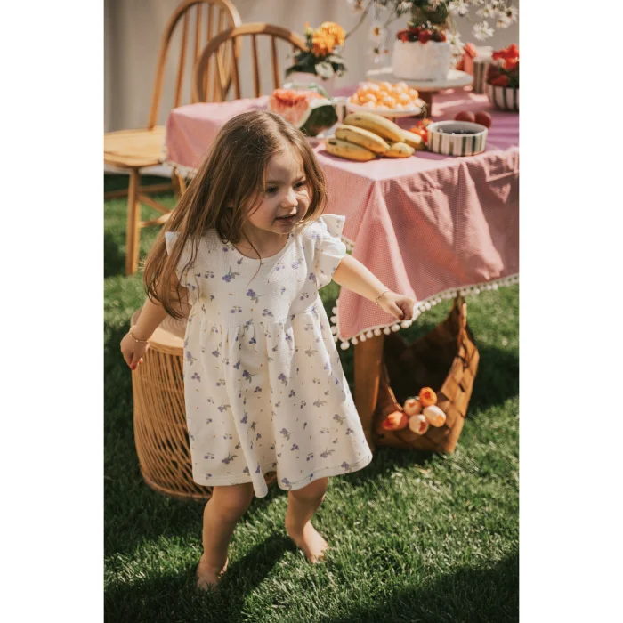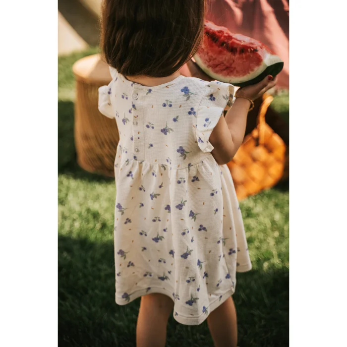 Kumaş içeriği %100 Organik Pamuktan oluşmaktadır. Ürün çocukların konforunu sağlayan yumuşak ve hafif bir yapıya sahiptir. Yazlık elbisenin yaka detayında düğmesi bulunur ve kolay kullanım saglar.