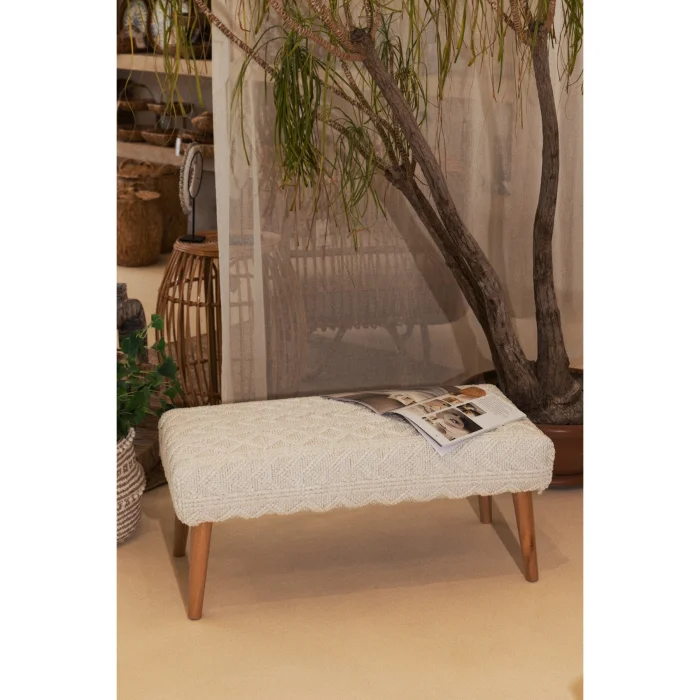 BLISS 4283 KREM KABARTMA DOKULU BENCH 42 X 91 X H 42 CM Bliss 4283 Krem Kabartma Dokulu Bench, yaşam alanlarınıza zarif ve işlevsel bir dokunuş katar. 42 cm yüksekliği, 42 cm derinliği ve 91 cm genişliği ile bu bench, cömert bir oturma alanı veya dekoratif bir obje olarak kullanılabilir. Kayın ağacından yapılmış ayakları, doğal ağaç görünümünü korumak için sadece mat vernikle kaplanmıştır ve rustik bir şıklık sunar. 7 cm kalınlığındaki sünger, orta yumuşaklıkta olup, uzun süreli kullanımda bozulma ve ezilme yapmaz. Geometrik desenli kendinden kabartmalı krem kumaşı ile modern, bohem veya eklektik tarzlara mükemmel bir şekilde uyum sağlar. Oturma odanızda, yatak odanızda veya giriş alanınızda kullanabileceğiniz bu bench, hem konfor hem de estetik arayanlar için ideal bir seçimdir. BLISS bench , iç mekanınıza sıcaklık ve stil katarak alanınızı güzelleştirir. Nemli bir bez ile silinerek kurumaya bırakılabilir. Yıkama yapılması önerilmez.