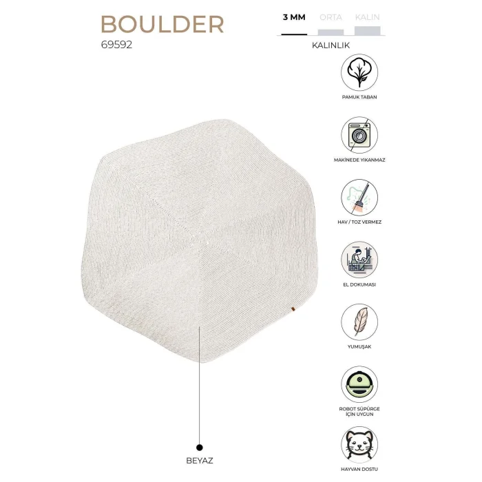 Klasik halı ebat ve formlarının dışına çıkılarak amorf tarzda tasarlanan Boulder Koleksiyonu, kendine has biçimlere sahip yapısıyla suya ve güneşe dayanıklı özel bir iplikten üretilmiştir. Dayanıklı ve uzun yıllar kullanıma uygundur. Kullanım alanları: Kendine özel yapısıyla evinizin istediğiniz her köşesinde kullanabileceğiniz fonksiyonel bir halıdır. Evcil hayvanlı alanlara uygundur. Yıkama talimatı: Makinede yıkama yapılmaz. Nemli bir bezle nazik bir şekilde siliniz.