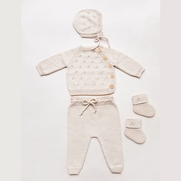 GOTS sertifikalı, organik pamuktan elde örülmüş bone, hırka, pantolon ve patik takımı