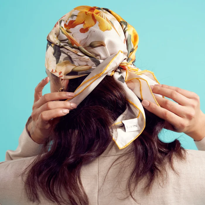 Materyal: %100 Twill İpek (14 mm) Kenar İşçiliği : Zanaatkarlarca özenle elde dikilmiştir Desen: Floral Boyut: 65x65 cm Kullanım: Boyun fuları, saç aksesuarı, kemer, çanta veya omuz aksesuarı olarak kullanabilirsiniz.