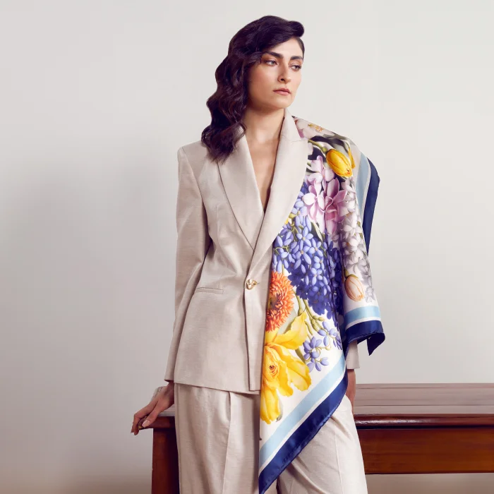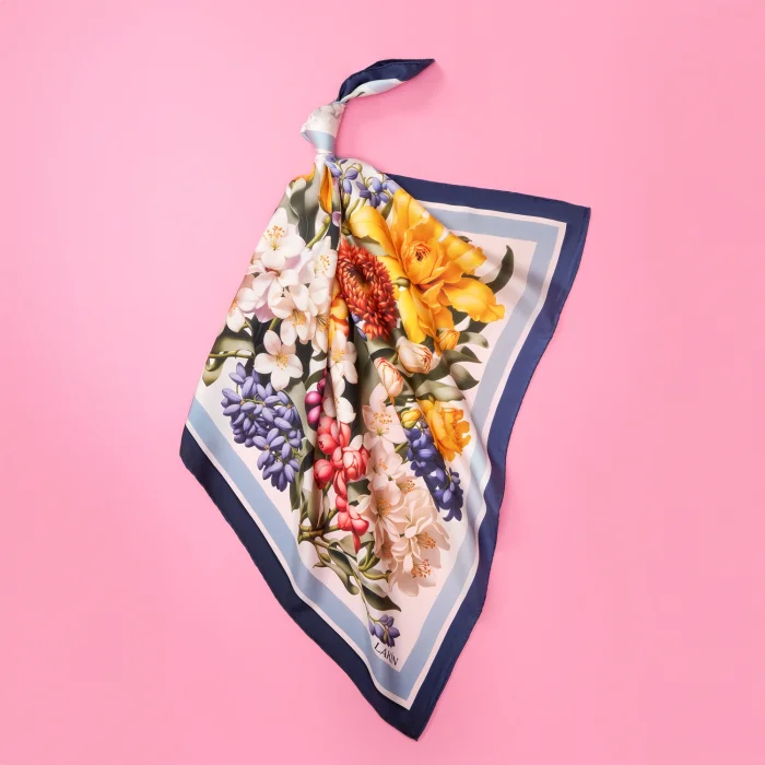Materyal: %100 Twill İpek (14 mm) Kenar İşçiliği : Zanaatkarlarca özenle elde dikilmiştir. Desen: Floral Boyut: 90x90 cm Kullanım: Boyun şalı, başörtüsü, saç, omuz veya plaj aksesuarı veya çanta süsü olarak kullanabilirsiniz.