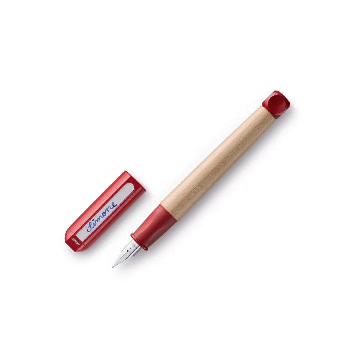 LAMY ABC Kırmızı Kapaklı Ahşap Gövdeli Dolma Kalem Akçaagaç gövde Parlak Çelik A uç Dolma kalem ile yeni tanışan çocuklar için özel tasarlanmış ergonomik grip Elin kayması önleyen plastik grip İsimlikli plastik kapak Tasarımcı: Entwicklungsgruppe Mannheim/Prof. Bernt Spiegel Üretim Yeri: Almanya