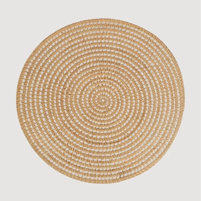 Doğal rattan malzemeden yapılmış yuvarlak bir duvar tabağıdır. El dokuması detaylarla süslenmiş bu dekoratif duvar tabağı, rustik ve bohem tarzları yansıtarak mekânlara doğal bir estetik katmaktadır. Doğal liflerin kullanımı sayesinde çevre dostu ve sürdürülebilir bir üründür. Özellikle modern, minimalist ve bohem iç mekan dekorasyonlarında tercih edilen bu tür duvar aksesuarları, sıcak ve samimi bir atmosfer yaratmak için idealdir.