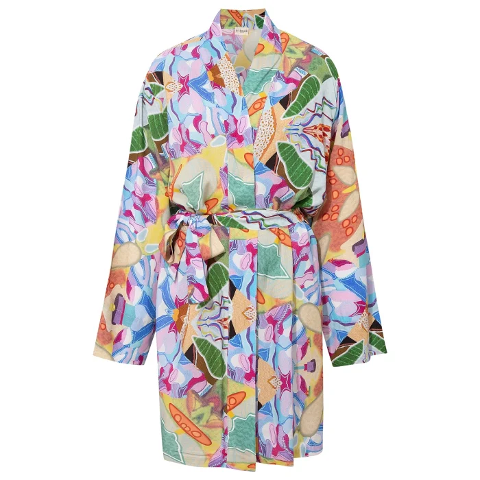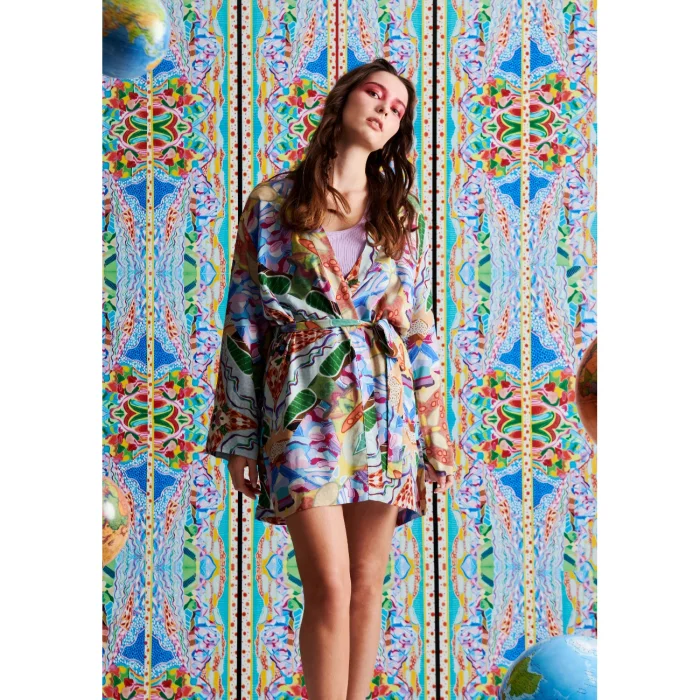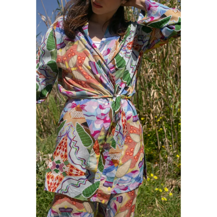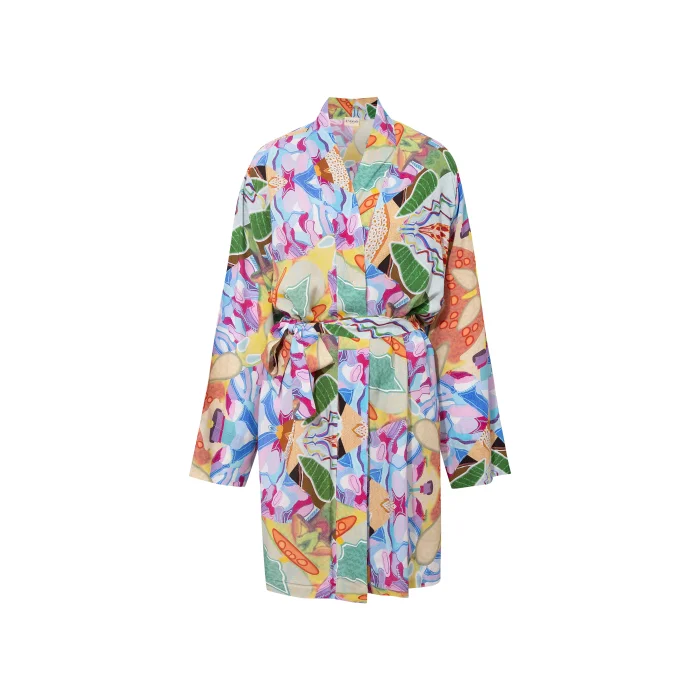 *Desenler, Sanatçı Defne Camcıoğlu’nun eserlerinden oluşturulmuştur, *%100 Viskon, *Doğal yumuşaklığı ve dökümlü yapısıyla viskon kumaş tercih edilmiştir, *Soyut desenlerden oluşan eser, viskon kumaş'a dijital baskı yöntemi ile basılmıştır, *Kimono yaka ve kuşak detayı ile şık bir görünüm sunmaktadır. BAKIM ÖNERİLERİ: *30 derecede yıkama yapılabilir, *Ağartıcı kullanılamaz, *Makinede kurutmayınız. BEDEN ÖLÇÜLERİ BOY:78