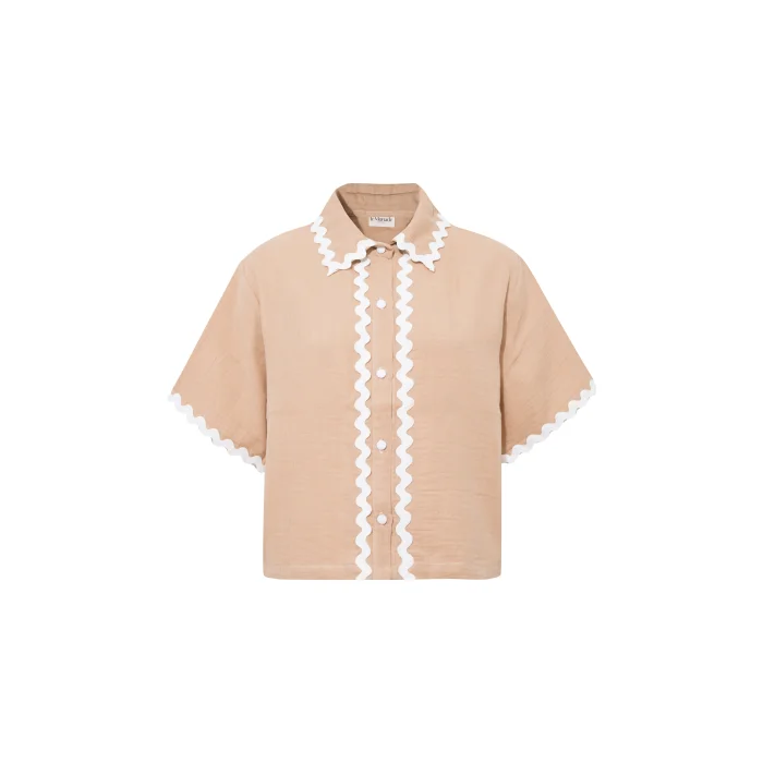 Su Taşı Detaylı Bej Kısa Kol Gömlek Desenler, Sanatçı Defne Camcıoğlu’nun eserlerinden oluşturulmuştur. %100 Koton