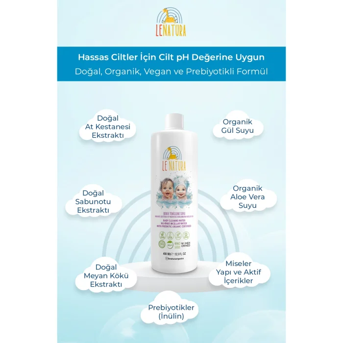 Organik gül suyu, aloe vera suyu, lavanta suyu, kekik suyu, mersin suyu ile doğal olarak elde edilen at kestanesi, meyan ve sabun otu ekstraktı içeren formülü bebeğin yüz, vücut ve bez bölgesini nazikçe temizlerken cildi yumuşatır, kullanım sonrasında yağlı olmayan, ferah ve nemlendirici bir etki bırakır.