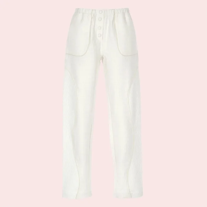 Logo kabartmalı jakarlı, beli lastikli, beyaz rahat brode pantolon. Blok ayrıntılarıyla tam uyum. İkinci Kumaş : %67 PES %31 COT %2 EA Makinede Yıkama 30 °C Kurutucuda Kurutmayın. Ters çevirerek yıkayın. Benzer renklerle yıkayın.