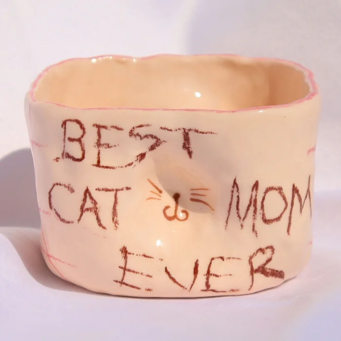 Ürün: Best Cat Mom Ever Kalemle Yazılı El Yapımı Seramik Kulpsuz Kupa - 200 Ml