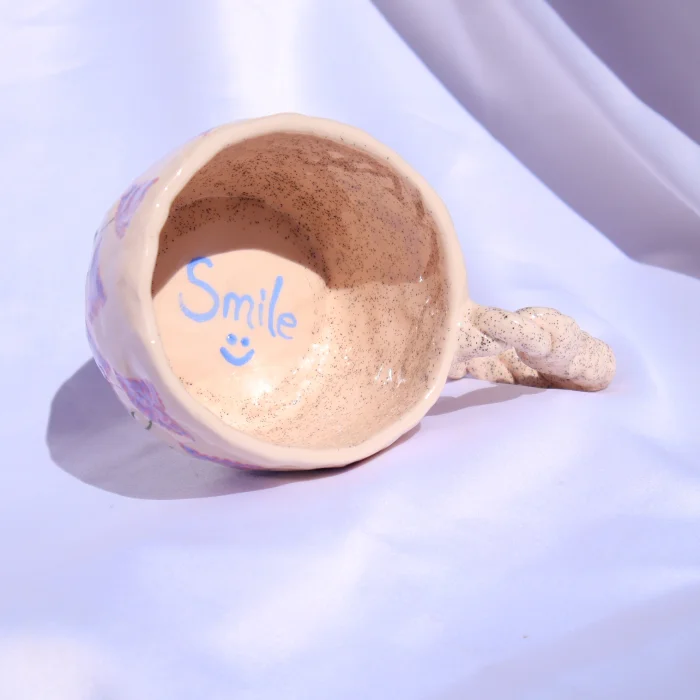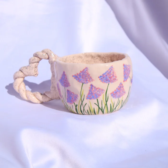 Ürün: El Yapımı Seramik Kupa - Lavanta Çiçek Desenli, Kalp Kulplu, Işıltılı Peri Tozlu 200 Ml