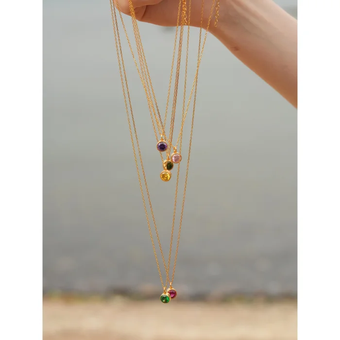 925 Ayar Gümüş 22 Ayar Altın kaplama Kolye Uzunluğu:45 cm + 5 cm uzatma Taş Renkleri: Yeşil, Mor, Lacivert, Açık Yeşil, Sarı, Pembe, Mavi, Kırmızı, Lila, Gök Mavisi, Beyaz, Turuncu Kolye Gramajı: 2.48gr