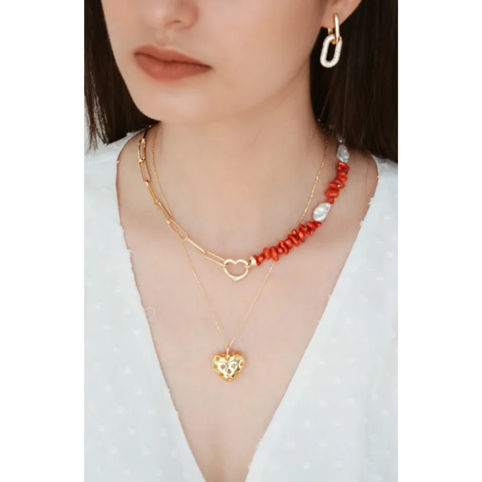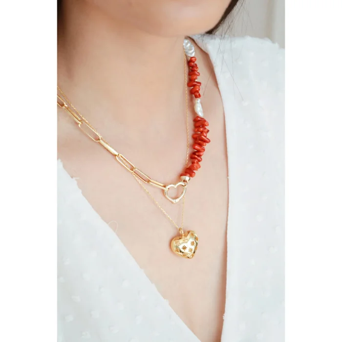 El yapımıdır."925 Ayar Gümüş, 22K altın kaplamadır. Kırmızı mercan ve doğal inci kullanılmıştır. Kolye ucundaki KALP detayından açılır ve kapanır.