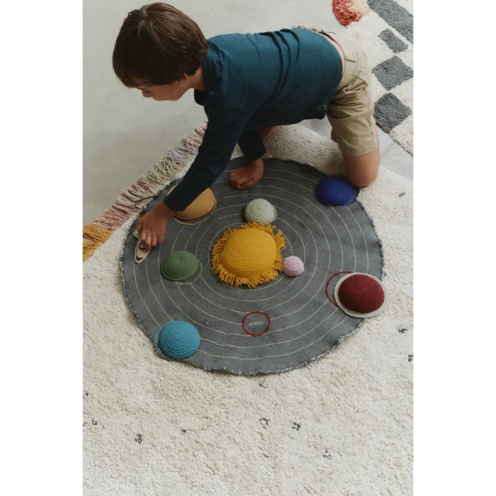 Güneş Sistemi Oyuncak Seti ile güneş sisteminin harikalarını keşfedin! Bu interaktif tekstil oyuncak seti, hayal gücünü harekete geçirmek ve eğlenceli öğrenmeyi teşvik etmek için tasarlanmıştır. Dayanıklı bir kanvas tabandan yapılmış olup, kolayca bir evrak çantasına katlanır ve hareket halindeyken rahat bir oyun deneyimi için tüm aksesuarları düzenli bir şekilde içeride tutar. Koyu gri ve petrol tuvali, canlı renklerle işlenmiş gezegenlerle birlikte gezegen yörüngelerinin doğal bir baskısını içeriyor. Set, doğru yörüngelere yerleştirilebilen örgülü pamuklu gezegenler ve çocuklar bir gezegenden diğerine seyahat ederken ekstra eğlence için mini bir tekstil roketi içerir. Oyun süresi bittiğinde tüm parçaları içine yerleştirin, tuvali bir evrak çantasına katlayın ve ince kordonlarla sabitleyin. Yerleşik tutma kolu, çocukların güneş sistemi maceralarını gittikleri her yere taşımalarını kolaylaştırır. İleri dönüştürülmüş kumaş artıklarından yapılan bu oyuncak seti, çevreye duyarlı aileler için sürdürülebilir bir seçimdir. Ev şeklinde geri dönüştürülmüş bir karton kutu içinde paketlenmiş olarak gelir ve oyuncakları kaldırma zamanı geldiğinde bile ekstra bir oyun unsuru sağlar.