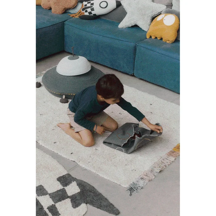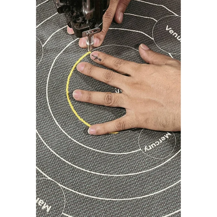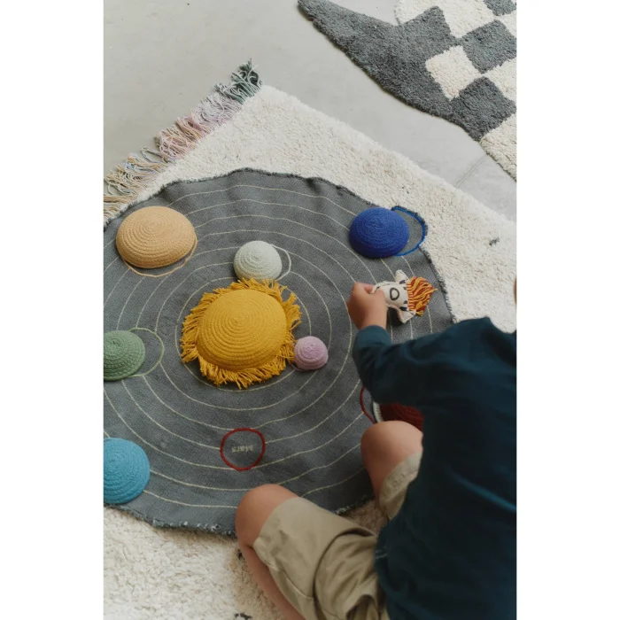 Güneş Sistemi Oyuncak Seti ile güneş sisteminin harikalarını keşfedin! Bu interaktif tekstil oyuncak seti, hayal gücünü harekete geçirmek ve eğlenceli öğrenmeyi teşvik etmek için tasarlanmıştır. Dayanıklı bir kanvas tabandan yapılmış olup, kolayca bir evrak çantasına katlanır ve hareket halindeyken rahat bir oyun deneyimi için tüm aksesuarları düzenli bir şekilde içeride tutar. Koyu gri ve petrol tuvali, canlı renklerle işlenmiş gezegenlerle birlikte gezegen yörüngelerinin doğal bir baskısını içeriyor. Set, doğru yörüngelere yerleştirilebilen örgülü pamuklu gezegenler ve çocuklar bir gezegenden diğerine seyahat ederken ekstra eğlence için mini bir tekstil roketi içerir. Oyun süresi bittiğinde tüm parçaları içine yerleştirin, tuvali bir evrak çantasına katlayın ve ince kordonlarla sabitleyin. Yerleşik tutma kolu, çocukların güneş sistemi maceralarını gittikleri her yere taşımalarını kolaylaştırır. İleri dönüştürülmüş kumaş artıklarından yapılan bu oyuncak seti, çevreye duyarlı aileler için sürdürülebilir bir seçimdir. Ev şeklinde geri dönüştürülmüş bir karton kutu içinde paketlenmiş olarak gelir ve oyuncakları kaldırma zamanı geldiğinde bile ekstra bir oyun unsuru sağlar.
