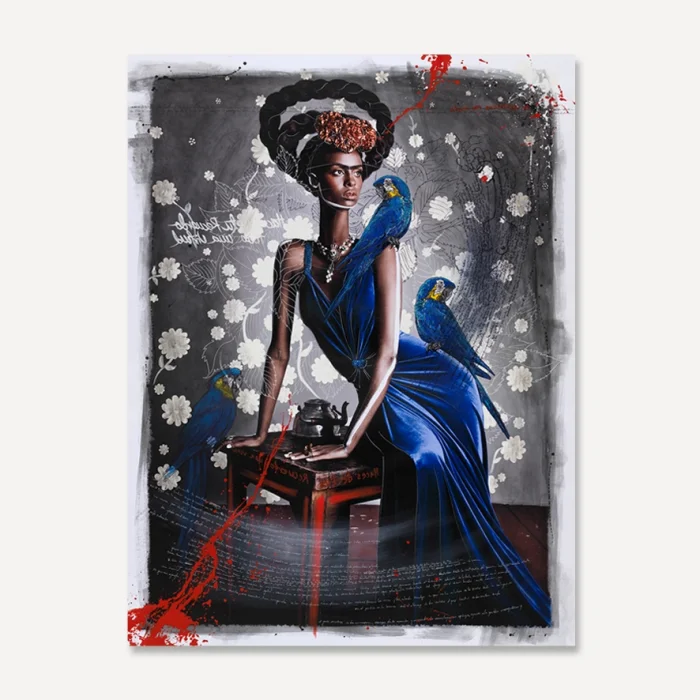 Ürün: Black Frida Seated With Blue Macaws By Efren Isaza Baskı