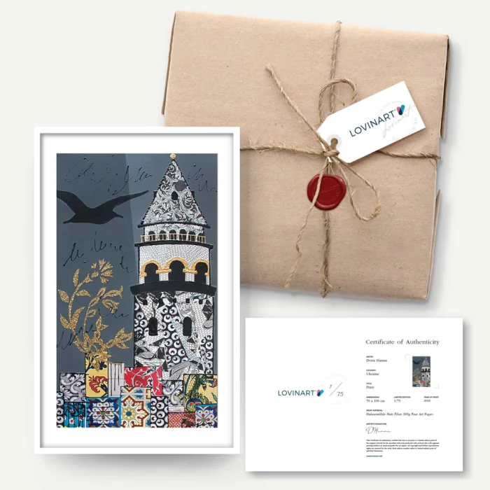 Limitli edisyonlu bir sanat eseri, sanatçı imzası ve hangi adetli edisyonun kaçıncı kopyası olduğu üzerinde belirtilen 'Orijinallik Sertifikası' ile birlikte sanat alıcısına gönderilir. Ayrıca, hangi teknikle ve kalitede üretildiği, kullanılan fine art kağıdı dahil tüm baskı özellikleri sertifika üzerinde yer alır.