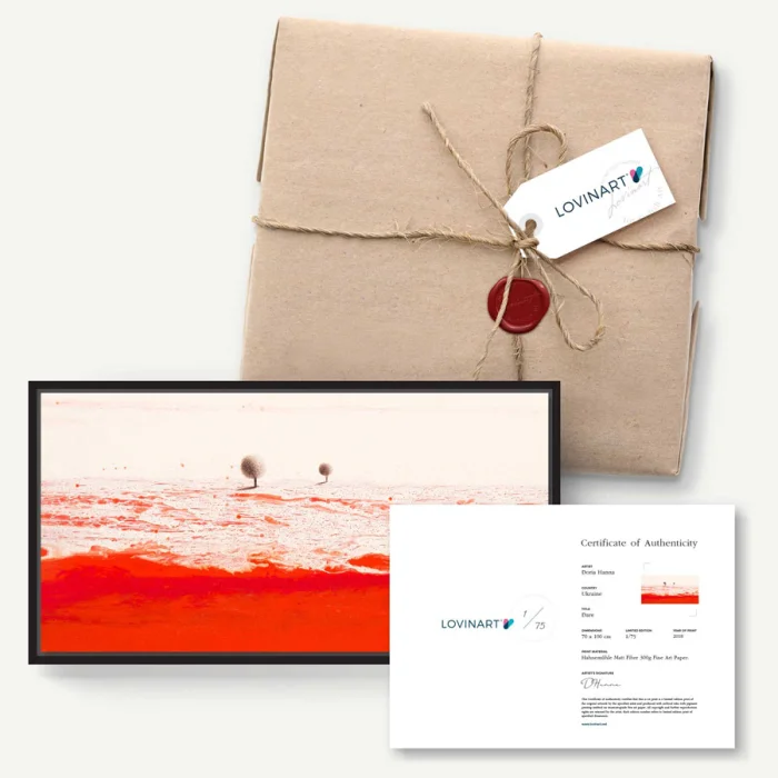 Limitli edisyonlu bir sanat eseri, sanatçı imzası ve hangi adetli edisyonun kaçıncı kopyası olduğu üzerinde belirtilen 'Orijinallik Sertifikası' ile birlikte sanat alıcısına gönderilir. Ayrıca, hangi teknikle ve kalitede üretildiği, kullanılan fine art kağıdı dahil tüm baskı özellikleri sertifika üzerinde yer alır.