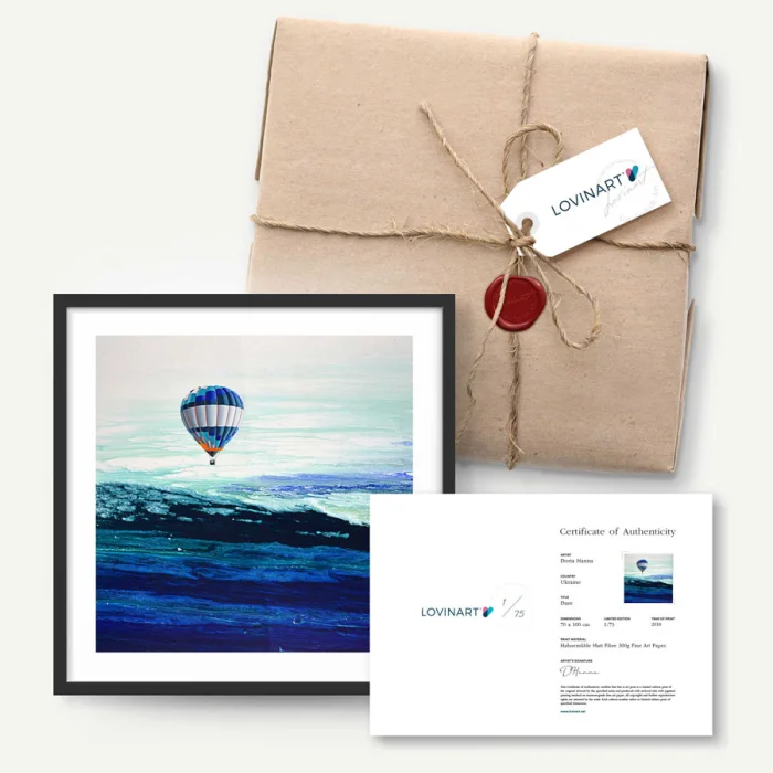 Limitli edisyonlu bir sanat eseri, sanatçı imzası ve hangi adetli edisyonun kaçıncı kopyası olduğu üzerinde belirtilen 'Orijinallik Sertifikası' ile birlikte sanat alıcısına gönderilir. Ayrıca, hangi teknikle ve kalitede üretildiği, kullanılan fine art kağıdı dahil tüm baskı özellikleri sertifika üzerinde yer alır.