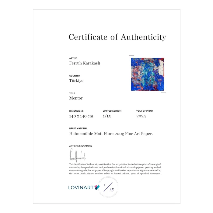 LİMİTLİ EDİSYON SANAT BASKILARI Edisyonlu sanat eseri, bir asıl eserin kopyalanmış veya bire bir yeniden üretilmiş versiyonu olarak tanımlanır. Limitli edisyonlarda üretim yapılırken eserin kaç edisyon olarak üretileceği, eser sahibi sanatçı gözetiminde önceden belirlenir ve eser bu adetten fazla üretilmez. ORİJİNALLİK SERTİFİKASI Limitli edisyonlu bir sanat eseri, sanatçı imzası ve hangi adetli edisyonun kaçıncı kopyası olduğu üzerinde belirtilen 'Orijinallik Sertifikası' ile birlikte sanat alıcısına gönderilir. Ayrıca, hangi teknikle ve kalitede üretildiği, kullanılan fine art kağıdı dahil tüm baskı özellikleri sertifika üzerinde yer alır. MÜZE KALİTESİNDE BASKILAR VE MODERN ÇERÇEVELEME SEÇENEKLERİ Dünya standartlarında baskı yapan makinelerle, yalnızca 200 gram Hahnemühle fine art kağıda, Giclée (püskürtme) tekniği kullanarak ürettiğimiz müze kalitesinde arşivsel pigment baskılar; normal oda şartlarında 100 yıldan fazla ömrü olan fine art baskılardır. Asitsiz ve %100 pamuk tabanlı, detay ve renklerde orijinal esere yakınlık bakımından mükemmel sonuç veren Hahnemühle fine art kağıtlar, solmaya karşı da garantilidir. Eserlerin rulo halinde yalnızca fine art baskılarını sipariş verebilir, ve hatta modern çerçeve alternatiflerimizden zevkine uygun olanı seçip, asılmaya hazır halde teslim alabilirsin. Tamamıyla el işçiliği ve titizlikle gerçekleştirdiğimiz çerçeveleme işlemini, uzun ömürlü, kaliteli malzemelerle yapıyoruz.