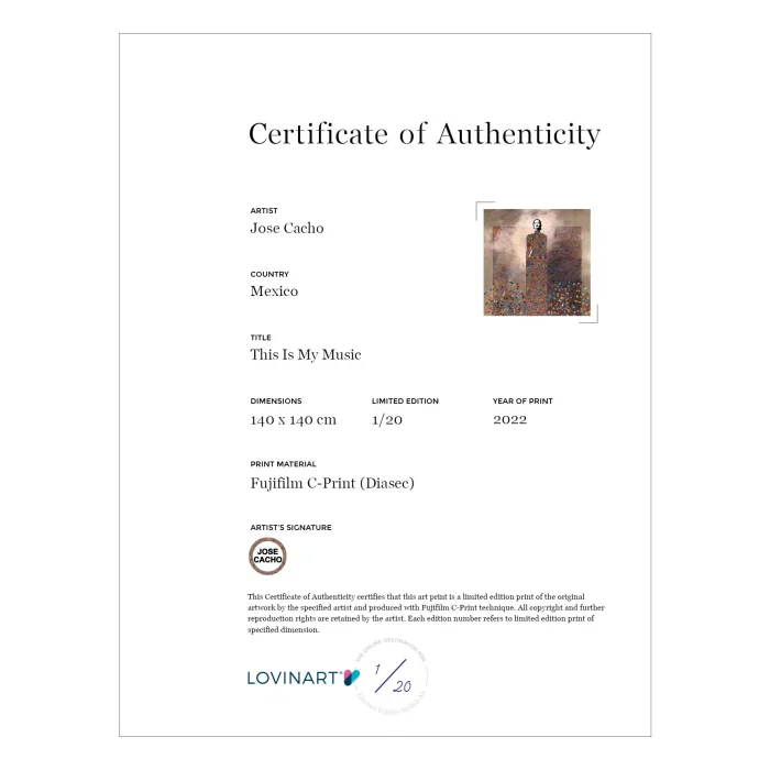 Limitli edisyonlu bir sanat eseri, sanatçı imzası ve hangi adetli edisyonun kaçıncı kopyası olduğu üzerinde belirtilen 'Orijinallik Sertifikası' ile birlikte sanat alıcısına gönderilir. Ayrıca, hangi teknikle ve kalitede üretildiği, kullanılan fine art kağıdı dahil tüm baskı özellikleri sertifika üzerinde yer alır.
