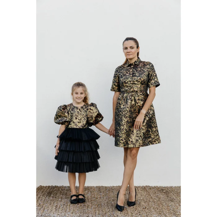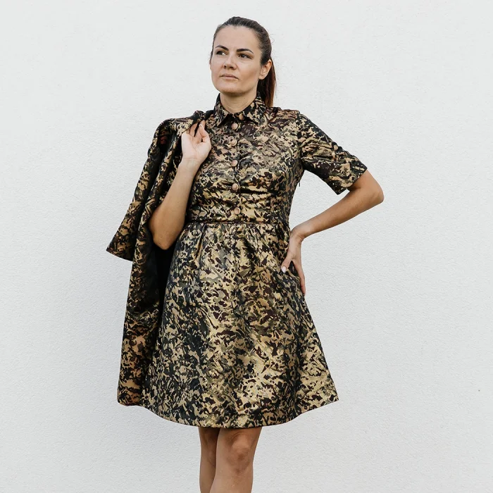Elbisemiz brokar dokuma kumaş, içi tamamen astarlı. roba detaylı , önden düğmeli yakalı.