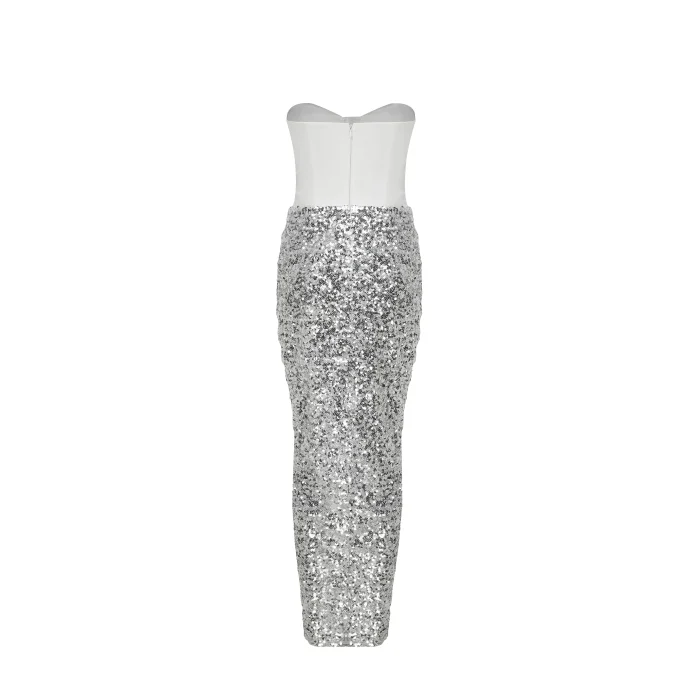 Gümüş pullu-payet straplez elbise.