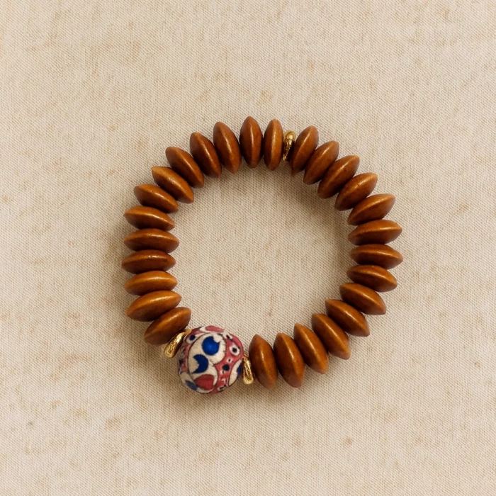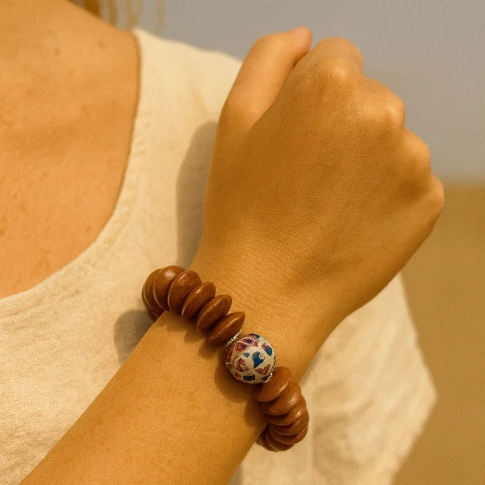 Doğal ahşap boncuklar ve çiçek motifli seramik boncuk modern bir yorum ile birlikte kullanılmıştır.