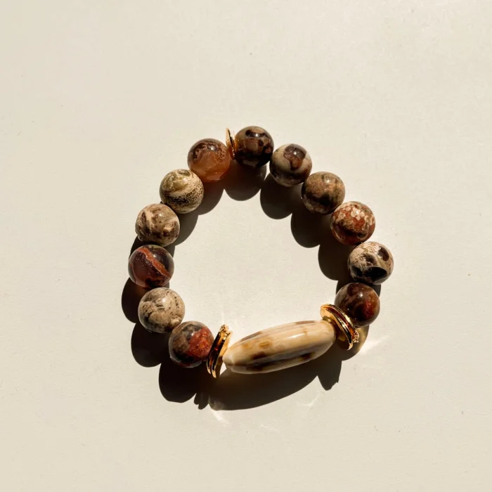 Akik doğal taş boncuklarımıza , ceviz renkli el oyması ahşap boncuk eşlik ediyor.