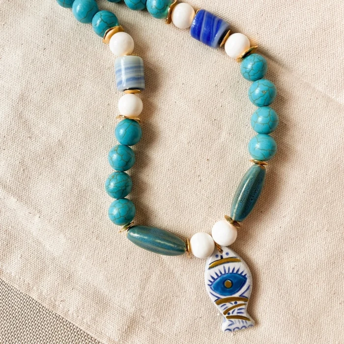 Turkuaz,Shell,Seramik ve cam boncuklar kullanılmıştır.